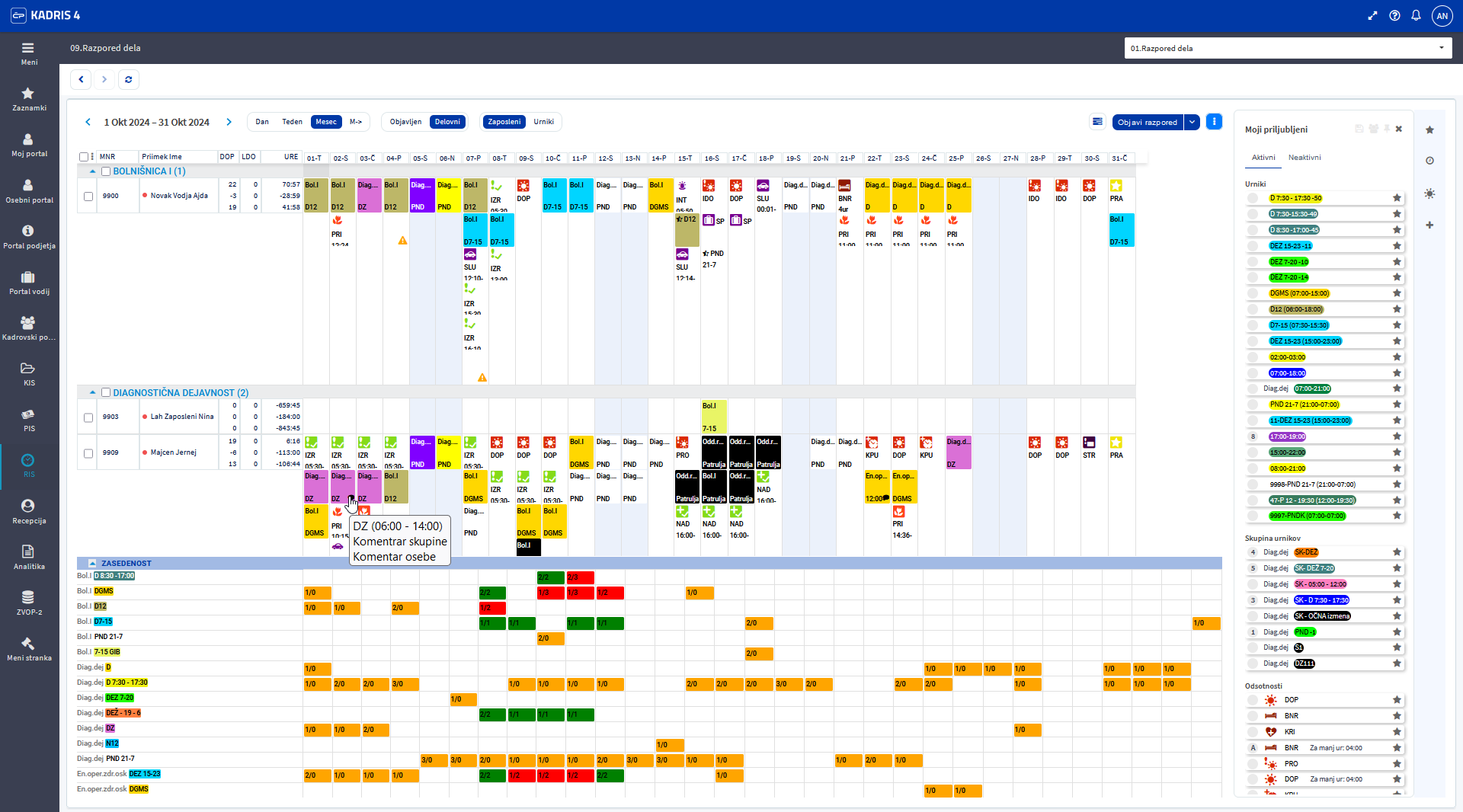 - Pogled Urniki: Prikaz razporeda dela po urnikih in skupinah urnikov s prikazanimi inicialkami zaposlenih. Ob izbiri dneva zamegli zaposlene, ki so na izbrani dan že razporejeni.