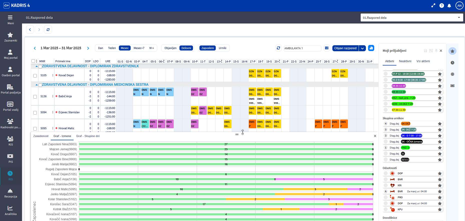 Grafi sta dostopna neposredno na istem mestu kot že obstoječe poročilo o zasedenosti po deloviščih in urnikih/izmenah, kar omogoča celovitejši vpogled in hitrejše odločanje pri razporejanju kadra.