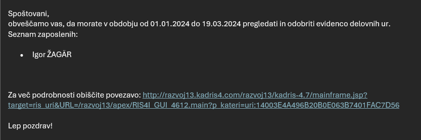 Registracijski sistem: Dvostopenjsko odobravanje E-dovolilnic za urne odsotnosti z E-obvestilom odobriteljem