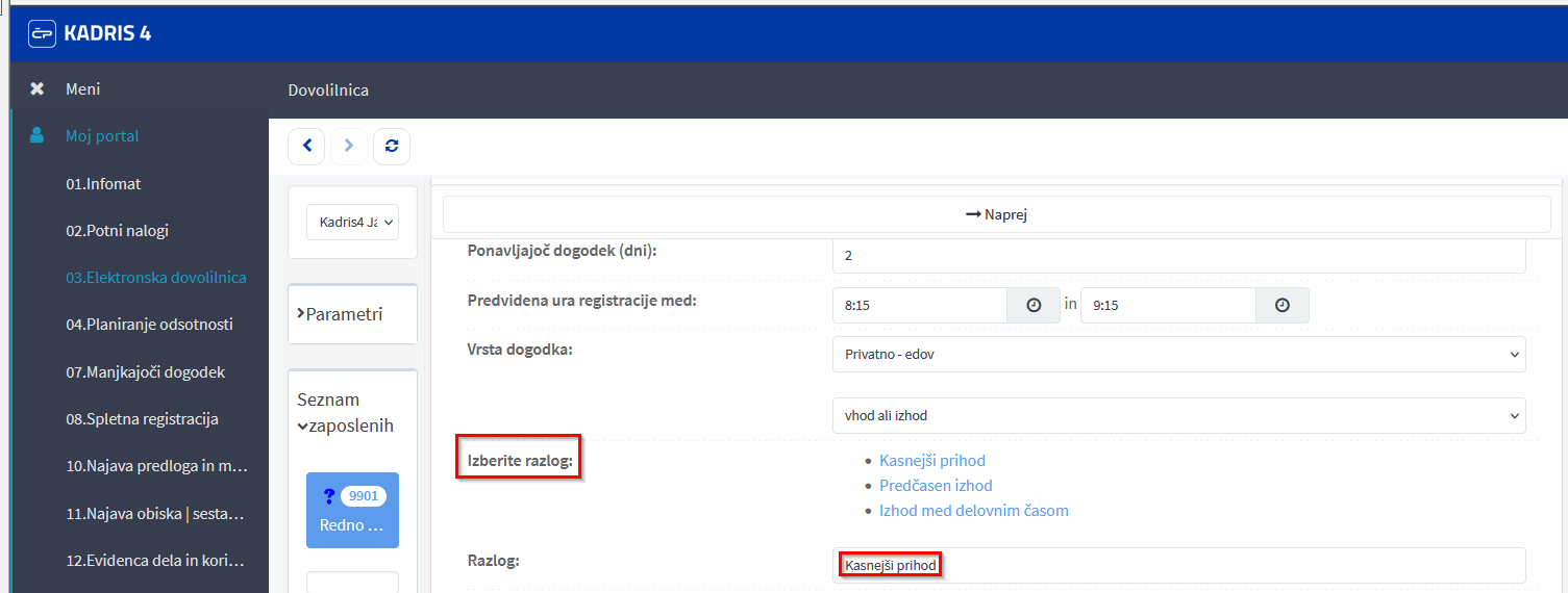 Registracijski sistem: E-dovolilnica za urne odsotnosti - novo polje Razlog odsotnosti in E-obvestilo razširjeno z razlogom
