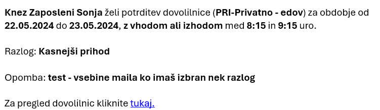 Vodje lahko v procesu odobravanja E-dovolilnic za urne odsotnosti v e-poštnem obvestilu vidijo razlog odsotnosti. Modul omogoča nastavitev različnih vrednosti razlogov, ki se samodejno vključijo v vsebino e-sporočila ob vnosu dovolilnice.